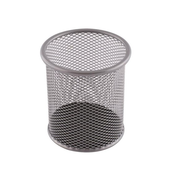 Kubek na długopisy metalowy, powleczony srebrnym lakierem.