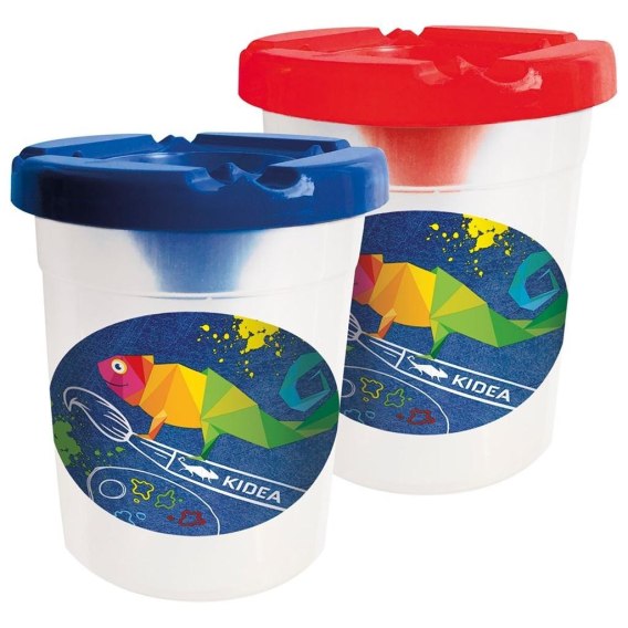 Kubek do płukania pędzli z blokadą wylania wody. Zastosowany lejek zabezpiecza przed wylaniem. Jest to idealne rozwiązanie dla najmłodszych artystów. Dla wygody, pokrywa kubka posiada miejsca na odłożenie pędzli.