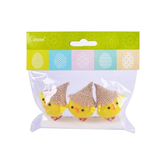Małe, żółte kurczaczki dekoracyjne w jutowych kapelusikach. Idealne jako ozdoba do koszyczka lub na wielkanocny stół. Pakowane po 3 sztuki. Wysokość kurczaka 6 cm.