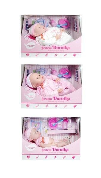 Gumowa lalka Dorotka wraz z akcesoriami: pieluszką, śliniaczkiem, butelką i miseczką z łyżeczką. Lalka interaktywna śpiewa piosenki: "Pieski małe dwa", "Jesteśmy jagódki", "My jesteśmy krasnoludki", oraz mówi, wita się, prosi żeby ją przytulić i ukołysać.