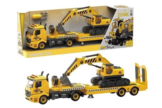 W zestawie: ciężarówka z lawetą, koparka, śrubokręt z 3 końcówkami, Funkcje: ciężarówka, efekty świetlne, dźwięki pracy silnika, sygnału, cofania, możliwość rozkręcania i skręcania cieżarówki i lawety, napęd frykcyjny, kompatybilne z drobnymi klockami, Pozostałe informacje: dł. lawety 60 cm, dł. koparki 24 cm, wym. opak. 63,5 x 22 x 12,5 cm, baterie 3 x ag13 dołączone testowe, 3+