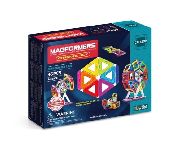 MAGFORMERS CREATOR CARNIVAL 46 to klocki z wbudowanymi silnymi magnesami neodymowymi, które zawsze się przyciągają. Wystarczy zbliżyć do siebie ściankami dwa klocki, a one natychmiast ze sobą się połączą. Za pomocą klocków wzorowanych na kształt figur geometrycznych można zbudować wspaniałe trójwymiarowe budowle. W zabawie można korzystać z dołączonej do zestawu instrukcji lub innych przykładów zamieszczonych na stronie producenta lub własnej wyobraźni. W skład zestawu wchodzi: 12 trójkatów; 22 kwadraty; 2 sześciokąty; 10 klocków specjalnych.