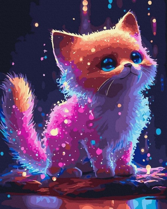 Uroczy kotek w neonowych kolorach, jakby pochodził z innej planety. Idealny wybór dla dzieci i wszystkich, którzy kochają słodycz i kolory.