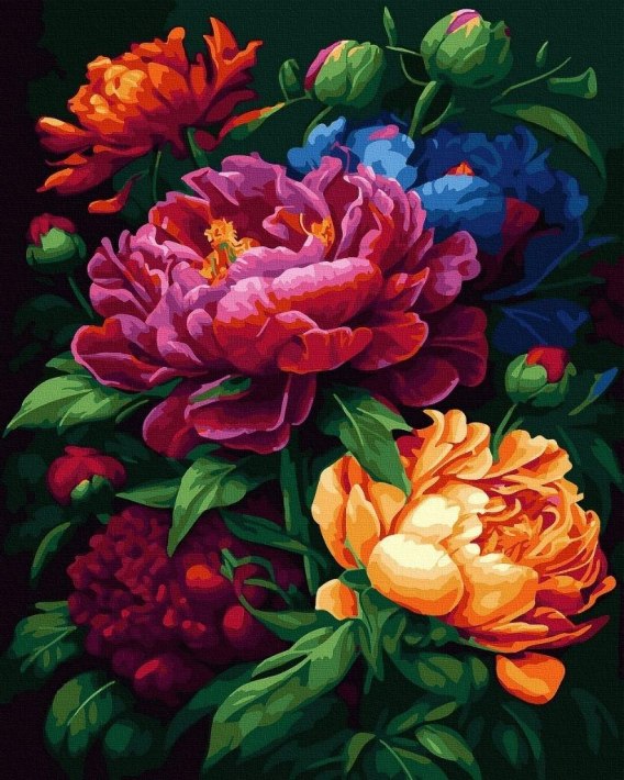 Pełne życia i kolorów piwonie w bogatym, realistycznym wydaniu. Doskonały wybór dla fanów klasycznych kwiatowych kompozycji.