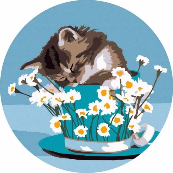 Malowanie po numerach okrągłe - Kotek i stokrotki