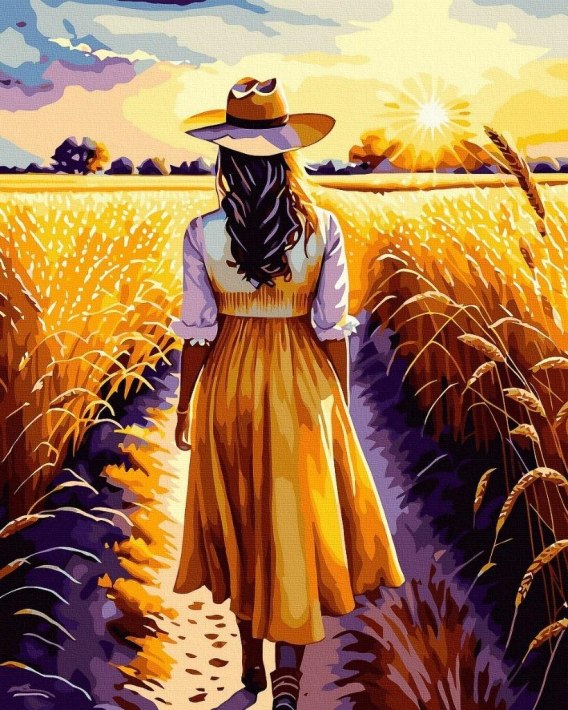 Kobieta w żółtej sukni przemierza słoneczne pola zbóż. Ciepła paleta kolorów i idylliczny klimat sprawiają, że obraz wprowadza spokój i nostalgię. Idealny do wnętrz w stylu rustykalnym i boho.