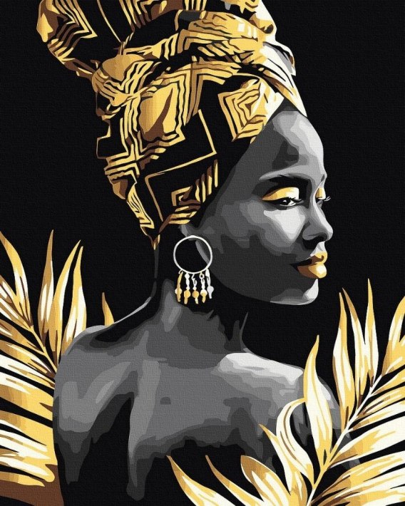Stylowy portret kobiety z Afryki w turbanie zdobionym złotem. Pełen siły i elegancji obraz, który pięknie ozdobi każde wnętrze.