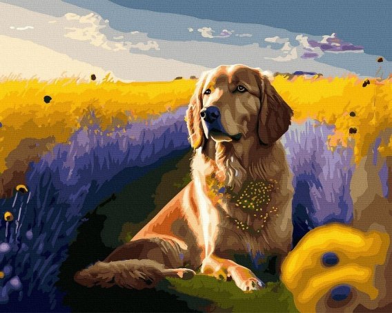 Uroczy pies leżący na tle żółto-fioletowego pola. Obraz pełen ciepła, przyjaźni i natury idealny dla miłośników zwierząt.