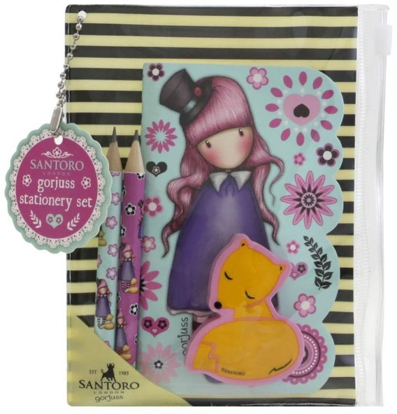 Mały Zestaw przyborów szkolnych - Gorjuss Fiesta - The Dreamer. Zestaw przyborów szkolnych w saszetce zamykanej na specjalny suwak. Wewnątrz znajduje się notes z gładkimi, różowymi kartkami, 2 mini ołówki oraz gumka w kształcie wiewiórki. Przydatne w szkole, biurze i w podróży.
