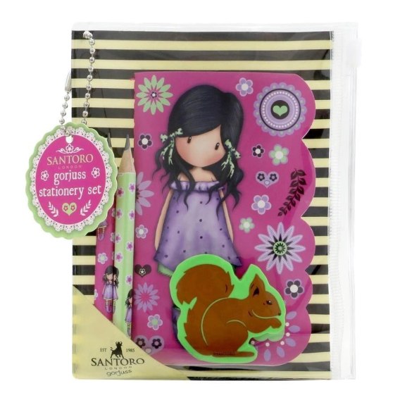 Zestaw składa się z notesu z gładkimi, różowymi kartkami, 2 mini ołówków oraz gumki w kształcie wiewiórki.