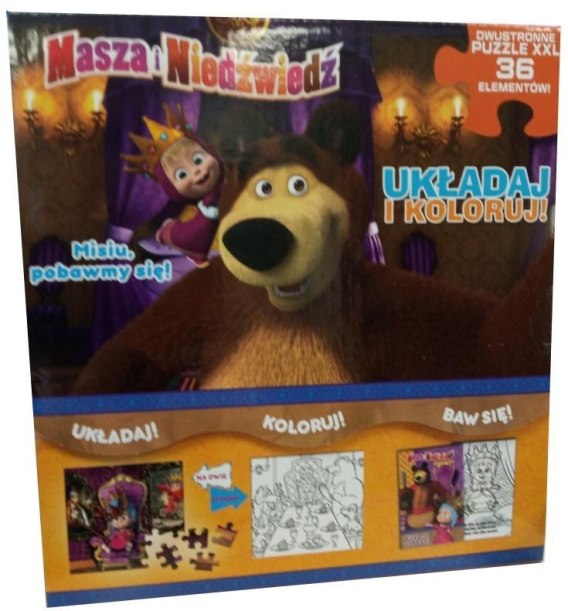 Oto pudełko pełne zabawy! Wewnątrz znajdziesz książeczkę z malowankami oraz dwustronne puzzle. Ułóż obrazek z Maszą i Niedźwiedziem, a potem odwróć układankę i pokoloruj scenkę według własnego pomysłu.