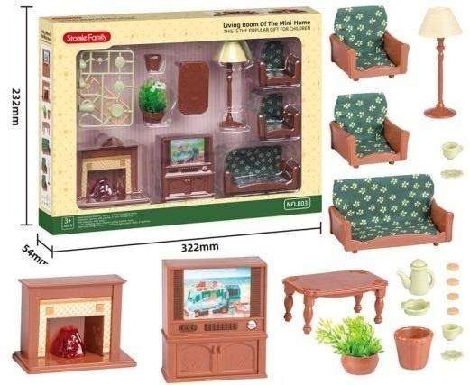 Przenieś świat wyobraźni do miniaturowego salonu z tym uroczym zestawem mebelków dla lalek z popularnej serii Stomple Family! Ten bogato wyposażony komplet zawiera wszystkie niezbędne elementy, aby stworzyć przytulną i stylową przestrzeń do zabawy. W zestawie znajdziesz wygodną sofę z miękkim wzorem w listki, dwa pasujące fotele, idealne do popołudniowej herbatki, oraz praktyczny stoliczek kawowy, na którym można ustawić drobne przekąski. Centralnym punktem salonu jest realistycznie wyglądający telewizor umieszczony na szafce, gotowy na wieczorne seanse filmowe. Ciepłą atmosferę zapewni kominek z imitacją płomieni, a stylowa lampa stojąca oświetli wnętrze podczas wieczornych rozmów. Zestaw zawiera również urocze akcesoria, takie jak dwie zielone roślinki w doniczkach, które dodadzą świeżości, oraz zestaw naczyń - imbryk, cukiernicę i dwie filiżanki z talerzykami - idealne do urządzenia przyjęcia dla lalek. Wykonane z dbałością o detale, te miniaturowe mebelki pobudzą kreatywność i zachęcą do odgrywania różnorodnych scenek z życia rodziny lalek. Zestaw przeznaczony jest dla dzieci powyżej 3 roku życia i stanowi doskonały dodatek do każdego domku dla lalek. Wymiary opakowania to 322mm x 232mm x 54mm.