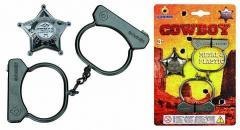 Kajdanki kowbojskie metalowe w zestawie z plastikową odznaką szeryfa.