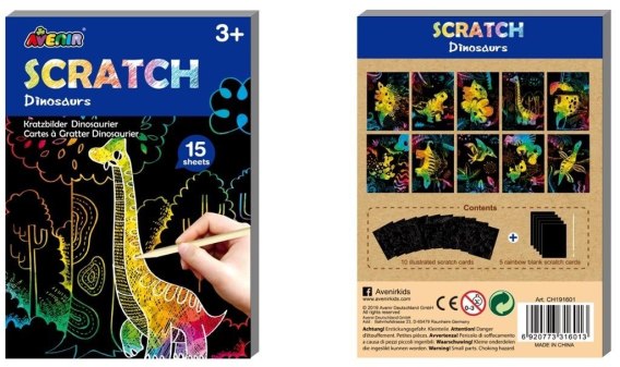 Mini książeczka z wydrapywankami to ciekawa propozycja dla kreatywnych dzieci. Prosta technika wydrapywania pozwala na stworzenie przepięknych oryginalnych obrazków przy niewielkim nakładzie pracy. Poręczny format książeczki doskonale sprawdza się, gdy dzieci są w ruchu. Zestaw zawiera 10 kolorowanek z dinozaurami i 5 "pustych" czarnych stron na dowolne rysunki, rysik. Zapewnia mnóstwo zabawy dla dzieci.