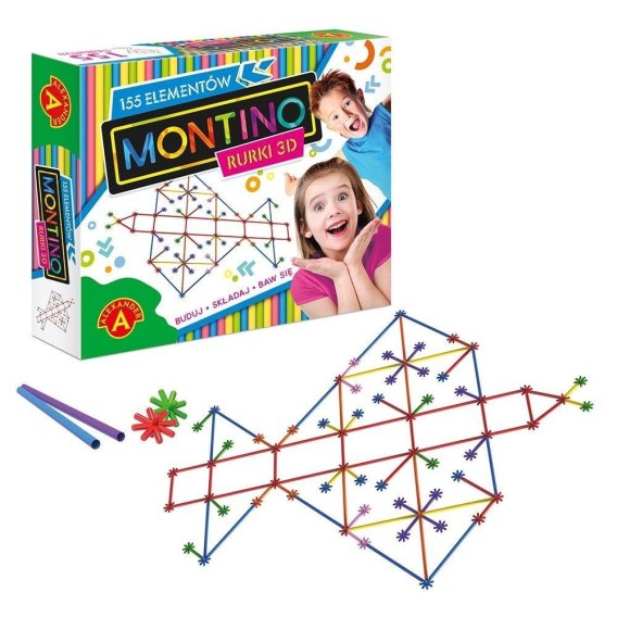 Montino to zestaw kreatywny do tworzenia fantazyjnych konstrukcji. W opakowaniu znajdziemy kolorowe rurki w trzech długościach (20 cm, 14 cm i 9 cm) oraz złączki. Te drugie pozwalają na tworzenie wspaniałych modeli. Katalog z inspiracjami dołączony do zestawu, wskaże co można z załączonymi rurkami robić. Wieżę, rakietę, domek, pawia, zamek i wiele więcej. Tak naprawdę ogranicza nas tylko i wyłącznie Wasza wyobraźnia. Wybieraj rurki, łącz ze sobą, w górę i w dół, w bok jeden czy drugi- twórz piękne budowle.