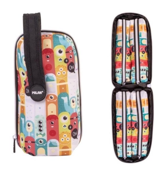 Piórnik MILAN 5 w 1 z wyposażeniem/multipiórnik z kolekcji ALIENS. Multipiórnik składa się z 5 elementów: 1 dużej saszetki - pokrowca zapinanego na suwak z uchwytem zapinanym na rzep oraz 4 mniejszych piórników-saszetek. W środku znajdują się 4 piórniki z wyposażeniem przyczepiane na rzepy, które można używać osobno lub jako całość. Specjalna seria Aliens, z wesołym wielokolorowym wzorem ułożonych kosmitów, te same postacie co w drewnianej zabawce "Wieża kosmitów", z czarną wewnętrzną podszewką. W zestawie przybory szkolne: 1 gumka 4024, 2 temperówki AFILA, 1 ołówek grafitowy HB, 3 długopisy P1 (niebieski, czarny i czerwony), 1 linijka 15 cm, 12 trójkątnych kolorowych kredek i 12 filamastrów ze stożkową końcówką. Skład: tkanina zewnętrzna i wewnętrzna podszewka 100% poliestru. Wymiary: 22,5 x 11,5 x 11 cm.