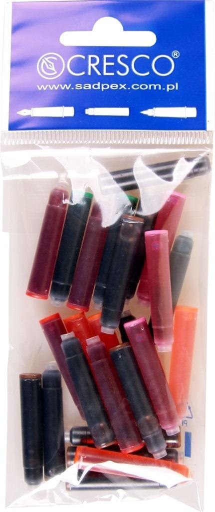 Kolorowe naboje atramentowe CRESCO zawierają najwyższej jakości atrament m.in. w kolorach: czerwony, turkusowy, zielony, fioletowy, pomarańczowy, brązowy, różowy. Pasują do tradycyjnych piór wiecznych ze stalówką oraz kulkowych na naboje. Opakowanie: woreczek z eurozawieszką zawiera 25 sztuk naboi w mixie kolorystycznym.