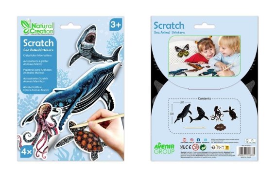 Dzieci będą miały mnóstwo frajdy, drapiąc wzory na naklejkach!Można je przykleić na dowolnej powierzchni i można je łatwo usunąć. W zestawie 4 sztuki tematycznych naklejek, drewniany rysik do zdrapywania oraz ściereczka.