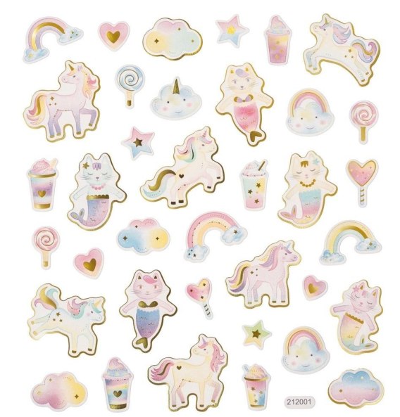 aklejki z jednorożcami, tęczami i kotkami-syrenkami. Uroku i blasku dodają im pastelowa kolorystyka, perłowy papier i złocenia.