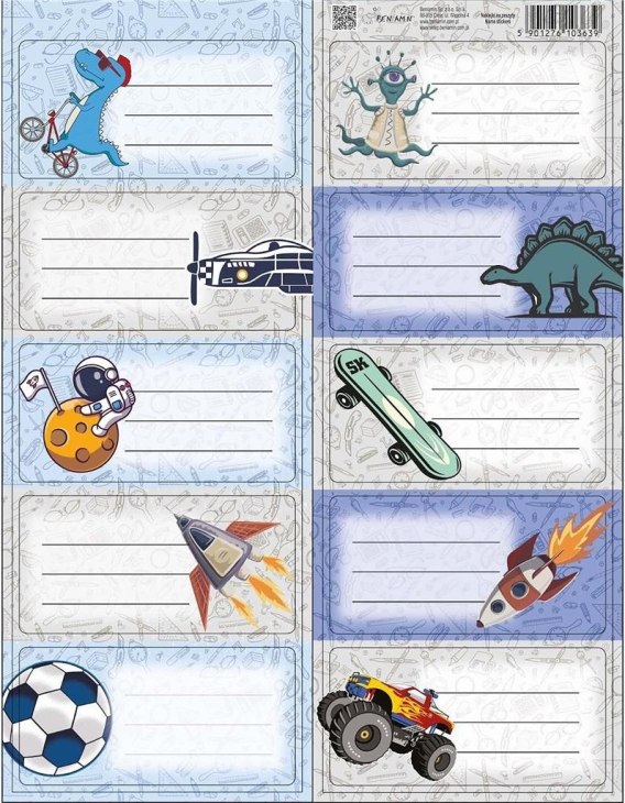 Łatwo usuwalne naklejki na zeszyty i książki. Na arkuszu znajduje się 10 etykiet Gramatura papieru 80g/m2.