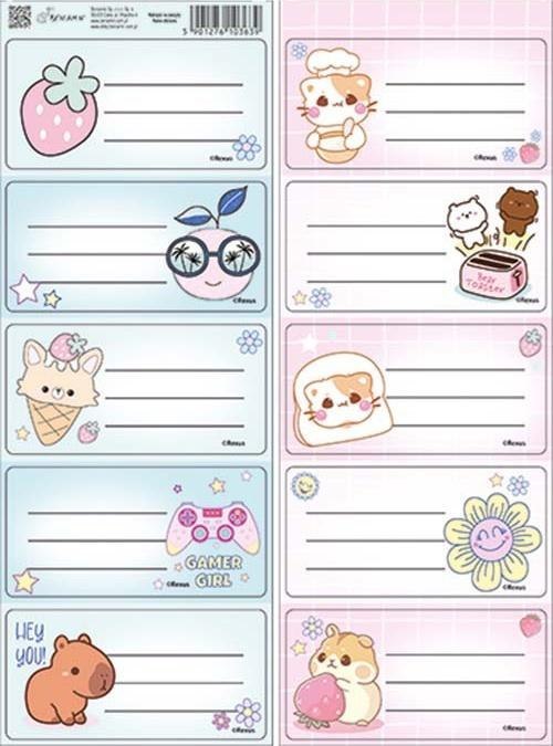 Łatwo usuwalne naklejki na zeszyty i książki. Na arkuszu znajduje się 10 etykiet Gramatura papieru 80g/m2.