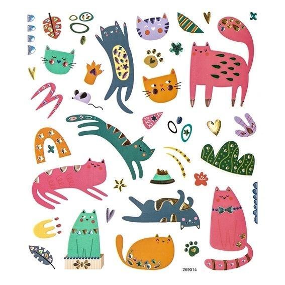 Foliowe naklejki z motywami zabawnych kotów w stonowanych kolorach z dodatkiem kryształków, uzupełnione małymi naklejkami z różnorodnymi dodatkami.