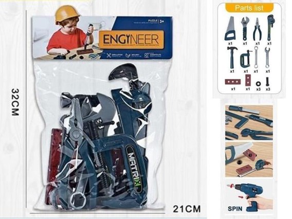 W zestawie: piła, klucz francuski, klucz nastawny, młotek, kombinerki, zacisk,