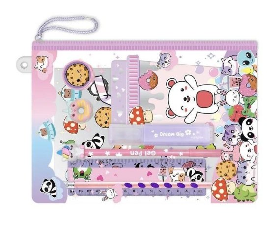 Zestaw zawiera: - notatnik z czystymi karteczkami - zakreślacz - długopis żelowy z ozdobną nakładką - ołówek - linijka - gumka do mazania - temperówka - arkusz naklejek Zestaw zapakowany w ozdobną saszetkę zamykaną na zamek z uchwytem do wygodnego przenoszenia. Wiek: 5+