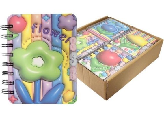 Uroczy notatnik A6 z fantazyjnymi, wypukłymi elementami w kształcie kwiatów i chmurek, utrzymany w pastelowej kolorystyce. Jest to doskonały wybór do robienia szybkich notatek, szkiców czy prowadzenia dziennika. Oprawa jest spiralna, co ułatwia wygodne przewracanie stron. Każdy notatnik ma na boku ozdobną tasiemkę z napisem "for you" i "love you". Notatniki sprzedawane są w opakowaniu zbiorczym zawierającym 20 sztuk, co sprawia, że są idealne zarówno do użytku indywidualnego, jak i jako upominki czy drobne podarunki. Podana cena w sklepie dotyczy jednej sztuki.