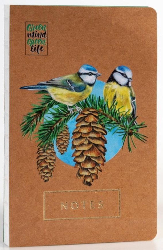 Gustowny notes ekologiczny Green Life. Notatnik z tekturową okładką pochodzącą z recyklingu i okładkową ilustracją sikorek w gnieździe.