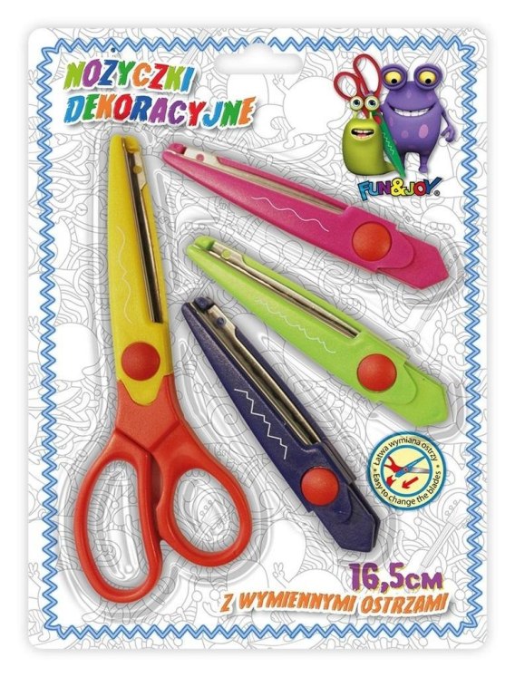 Nożyczki dekoracyjne do wycinania fantazyjnych wzorów. Ostrza wykonane ze stali nierdzewnej w plastikowej obudowie w różnych kolorach, charakterystycznych dla danego wzoru cięcia, uchwyt nożyczek z mocnego, trwałego plastiku. Długość nożyczek: 16,5 cm. Zestaw zawiera nożyczki i 3 wymienne ostrza każdy z innym wzorem cięcia.