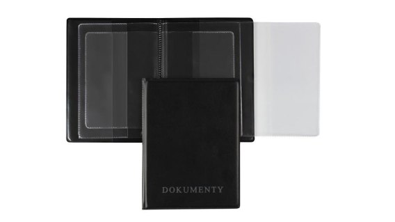 Okładka wykonana z czarnej folii PVC, wewnątrz usztywniona tekturą. Posiada kieszenie, które pomieszczą dowód osobisty, prawo jazdy, dowód rejestracyjny i inne potrzebne dokumenty.