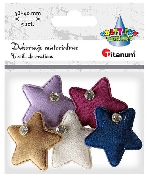 Aplikacje materiałowe gwiazdki z kryształkiem 38x40mm granatowe, ciemnoczerwone, wrzosowe, jasnobrązowe, kremowe 5szt.
