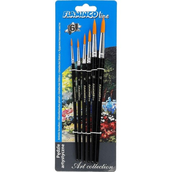 Zestawy 6 pędzli artystycznych z włosiem syntetycznym. Wytrzymałe drewniane uchwyty w czarnym kolorze z oznaczeniem grubości pędzla. Sprawdzą się idealnie zarówno na zajęciach malowania farbami w szkole, jak i w domu. Zestaw zawiera 6 pędzli okrągłych nr: 2, 4, 6, 8, 10, 12. Pakowane na blistrze.