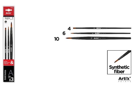 Profesjonalny pędzel do malowania z bardzo miękkiego włosia syntetycznego. Dwa bardzo cienkie pędzle z okrągłą końcówką i jeden pędzel z płaską końcówką (P) idealne do wykonywania detali lub udoskonalania wykończeni farbami akwarelowymi,temperowymi lub akrylowymi. Drewniany korpus lakierowany na czarno. Długość: 20cm. Blister po 3 sztuki: 2 pędzle z skuwką okrągłą cyfry 6 i 10 oraz pędzel z skuwką płaską cyfry 4.