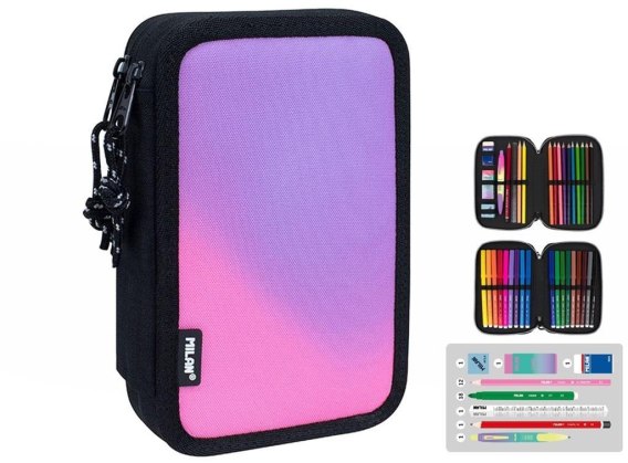 Piónik 2 - poziomowy z wyposażeniem z kolekcji SUNSET w kolorze czarno - różowym. Połączenie gradientowych kolorów inspirowanych zachodem słońca z czarno-białymi detalami. Wyposażenie: 12 kredek trójkątnych, 18 flamastrów ze stożkową końcówką, długopis COMPACT SUNSET niebieski, ołówek sześciokątny HB, linijka trójkątna 15 cm, temperówka kwadratowa AFILA, 2 gumki 4024 i 320SN. Każdy poziom osobno zapinany na suwak. Przy produkcji piórników użyto najlepszych materiałów, bardzo wytrzymałych suwaków oraz wzmocnionych nici. Niepowtarzalne wzornictwo. Tkanina zewnętrzna Ripstop: lekka i odporna na rozdarcia. Wykorzystuje specjalną technikę, która tka grube, wzmacniane nici w regularnych odstępach, tworząc wzór krzyżowy. Materiał zewnętrzny i wewnętrzny 100% poliester. Rozmiar piórnika: 19,5 x 13 x 5 cm. W piórnikach znajdziesz min.: kredki MILAN przy produkcji których użyto drewna pochodzącego wyłącznie z plantacji, gwarantujących nie używanie drewna z lasów deszczowych. Rysik kredki na całej długości jest przyklejony do drewna co zapobiega jego łamaniu. Dzięki trójkątnej budowie kredka jest ergonomiczna i wygodnie trzyma się dziecku. Flamastry MILAN posiadają wytrzymałą i elastyczną stożkową końcówką, która nie wpada do środka nawet przy silnym nacisku. Po chwilowym odkształceniu końcówka zawsze wraca do pierwotnego kształtu. Tusz na bazie wody. Flamastry nie zawierają ftalanów, metali ciężkich i innych. Temperówkę z bezpiecznym przykręconym ostrzem dzięki czemu ostrze nie oddzieli się od obudowy temperówki. Gumkę z naturalnym kauczukiem.