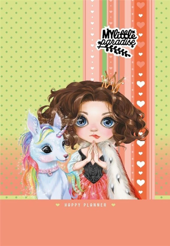 Ozdobny planer "My little paradise", w twardej oprawie z brokatem dedykowany dziewczynkom. Zawiera 96 kartek w kratkę, z różnokolorowymi marginesami oraz ilustracjami. Znajdują się w nim plan lekcji, jak i strony z łamigłówkami. Planer jest w języku angielskim, wyprodukowany na Ukrainie.