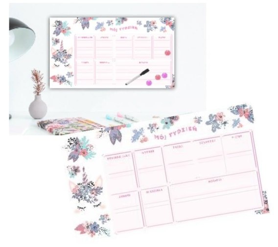 Idealny na lodówkę. Pozwoli zaplanować zajęcia szkolne jak i poza szkolne. Może służyć jako plan lekcji, czy obowiązków domowych. Markery suchościeralne