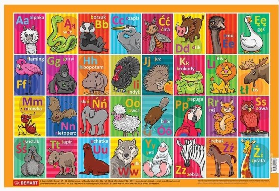 Podkładka z polskim alfabetem jest sympatyczną pomocą wspomagającą młodego ucznia. Pokazuje różnice w graficznym obrazie małej i dużej litery drukowanej, przykładowe wykorzystanie wszystkich liter w zapisach nazw zwierząt oraz uczy kolejności liter w polskim alfabecie, z uwzględnieniem polskich znaków diakrytycznych, takich jak: ą, ę, ć, ł, ń, ó, ś, ź, ż. A przy okazji może zostać wykorzystana do gry w inteligencję (znanej też pod nazwą państwamiasta) w kategorii zwierzęta. Wszystkim literom towarzyszą humorystyczne rysunki zwierząt. Użytkowe walory podkładki są jej kolejnym atutem: jest wykonana na gumowanej piance dobrze stabilizującej ją na biurku, na wierzchu pokrywa ją przezroczysta matowa folia przyjemna w dotyku po której nawet można pisać pisakiem i ścierać potem zapiski.