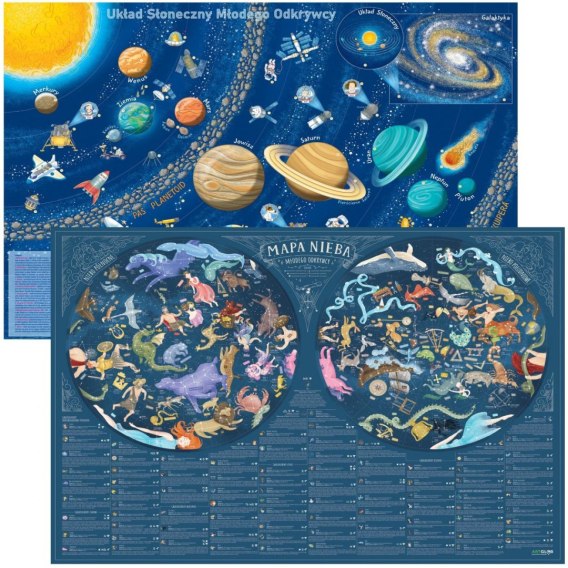 3, 2, 1 Start! Rozpoczynamy poszukiwania Wielkiej Niedźwiedzicy! Z myślą o dzieciach stworzyliśmy mapę, której celem jest przybliżenie im astronomicznych faktów i ciekawostek o układach gwiezdnych. Dzięki starannie wykonanej, bajecznej grafice obfitującej w żywe kolory mapa przyciągnie uwagę każdego ucznia. I kto wie? Być może będzie to początek astronomicznej pasji! Zastosowaliśmy między innymi podział na niebo północne i południowe, a do każdej z opisywanych konstelacji przyporządkowaliśmy właściwy jej symbol oraz dodatkowe fakty o okresie widoczności danego gwiazdozbioru w Polsce i jego pozycji na liście gwiazdozbiorów, ustalanej według wielkości powierzchni. W dolnej części mapy znajduje się legenda, będąca zbiorem informacji dobranych tak, by w prosty sposób opowiedzieć o fascynującym, kosmicznym świecie. Gwarantujemy, że Mapa Nieba dla dzieci znacznie ułatwi naukę w domowych warunkach oraz dopełni treści zdobyte w szkolnej ławce, na ścianie zwiśnie jako wymarzona ozdoba każdego pokoju, a przewiązana wstążką będzie wymarzonym prezentem Twojej pociechy.