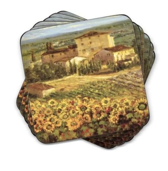 Zestaw sześciu przyciągających wzrok i praktycznych podkładek korkowych, ozdobionych przepięknym krajobrazem skąpanych w słońcu pól słonecznika i domu z Toskanii w otoczeniu strzelistych cyprysów. Podkładki wykonane są z wytrzymałego korka o grubości 5 mm i całkowicie uszczelnione wysokiej jakości lakierowaną powłoką. Dzięki czemu bardzo dobrze izolują wysoką i niską temperaturę, chroniąc blaty, stoły i inne powierzchnie przez uszkodzeniem. Podkładki są odporne na plamy i wysoką temperaturę do 100 C. Należy je czyścić wilgotną gąbką. Nie zaleca się zanurzać w wodzie i wkładać do zmywarki. Zestaw zawiera: 6 szt.