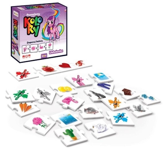 Świat wokół nas jest pełen kolorów. Układanka pomaga dzieciom w nauce rozpoznawania barw przedmiotów, roślin i zwierząt. Zawiera 48 puzzli: 12 kolorów, które dzieci łączą w odpowiednie zestawy. Czarne przegrywa, kolor wygrywa, w kolory grajmy dziś - śpiewaliśmy w znanej Piosence KOLOROWEJ. Grajmy więc w kolory!