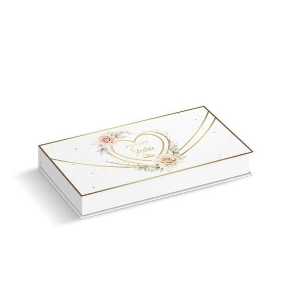 Ozdobne Pudełko PD Pamiątka Ślubu - to doskonały sposób na estetyczne i wyjątkowe zapakowanie banknotu lub karty podarunkowej. Jego klasyczny design podkreślają złote zdobienia, które dodają mu szyku i podniosłego charakteru. Magnetyczne zamknięcie sprawia, że pudełko można wielokrotnie otwierać i zamykać, a starannie dobrane życzenia w środku czynią je idealnym wyborem na szczególne okazje. Wymiary produktu: 18 cm x 9 cm Zamknięcie: magnetyczne Wnętrze: eleganckie życzenia w środku
