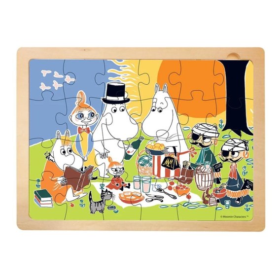 Drewniane Puzzle, 24 el. Muminki - Piknik Wielobarwne, fantastyczne drewniane puzzle w ramce złożone z 24 elementów. Na puzzlach znajdują się kolorowe obrazki Muminków z Doliny Muminków, ilustracje pochodzą ze świata Muminków, stworzonego przez wszechstronnie utalentowaną artystkę Tove Jansson, jedną z najlepszych fińskich artystek wszechczasów, a także najczęściej czytaną fińską autorkę za granicą. Piękna i solidna drewniana układanka typu "rama w ramie", która zapewni najmłodszym wiele godzin zabawy i rozwoju. Produkt ten wspiera rozwój percepcji wzrokowej oraz małej motoryki dziecka. Puzzle to doskonałe narzędzie edukacyjne. Podczas ich układania aktywujemy obie półkule mózgu. Jest to istotne szczególnie u najmłodszych dzieci, ponieważ to właśnie wtedy mózg rozwija się najintensywniej. Układanie puzzli przynosi wiele korzyści, takich jak rozwój koordynacji ręka-oko, dużej i małej motoryki, rozpoznawania kolorów i postaci, pamięci, umiejętności rozwiązywania problemów, cierpliwości, kompetencji społecznych, a także wspiera relaksację i zdolność koncentracji. Dla najmłodszych warto wybierać proste układanki z kilkoma dużymi elementami, a wraz z wiekiem dziecka sięgać po trudniejsze zestawy z mniejszymi częściami. Drewniane puzzle w ramce. Obrazek posiada otwór na paluszek, dla wygodnego wyłożenia pierwszego puzzla. Dzięki układance dzieci mogą trenować koordynację ruchową, pamięć, cierpliwość. Puzzle wspomagają umiejętności motoryczne, rozpoznawanie kolorów i kształtów, rozwiązywanie problemów. Wymiary puzzla: 7,5 cm x 4,5 cm x 0.05cm., 6 cm x 5 cm x 0.05 cm. Wymiary obrazka: 27 cm x 19,5 cm x 1 cm. Wymiary opakowania: 22 cm x 30 cm x 1 cm. Kategoria wiekowa: 2+. Produkty Barbo Toys są projektowane w Danii, ze szczególną dbałością o zrównoważony rozwój i wysokiej jakości materiały. Zabawki są wytwarzane zgodnie z filozofią "nauka przez zabawę" i aktywnie wspierają i stymulują zarówno wyobraźnię jak i edukację dziecka, przy tym charakteryzują się doskonałym skandynawskim wzornictwem.