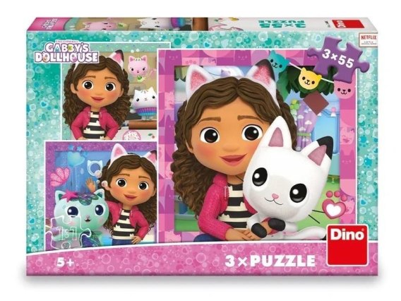 Zestaw puzzli 3-w-1 to idealna propozycja dla małych fanów bajki Koci Domek Gabi. W pudełku znajdują się trzy osobne układanki, każda składająca się z 55 elementów. Kolorowe ilustracje (po ułożeniu 18 x 18 cm) przedstawiają ulubionych bohaterów w pełnych radości scenach, a odpowiednio dobrana wielkość elementów ułatwia układanie dzieciom od 5. roku życia. Czeski producent Dino Toys dba o najwyższą jakość wykonania - puzzle powstały z trwałego, bezpiecznego kartonu i posiadają certyfikat CE, potwierdzający zgodność z europejskimi normami bezpieczeństwa.