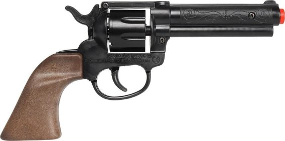 Rewolwer z tworzywa na kapiszony 8-strzałowy wyprodukowany w Hiszpanii. Cechuje go realistyczny wygląd i dźwięk wystrzału (kapiszony do nabycia osobno). Trwałe wykonanie z wysokiej jakości tworzywa, bębenek metalowy. Bezpieczny - odpowiedni dla dzieci 3+ Długość: ok. 20 cm. Wymiary opakowania 20,5 x 8 x 3 cm.