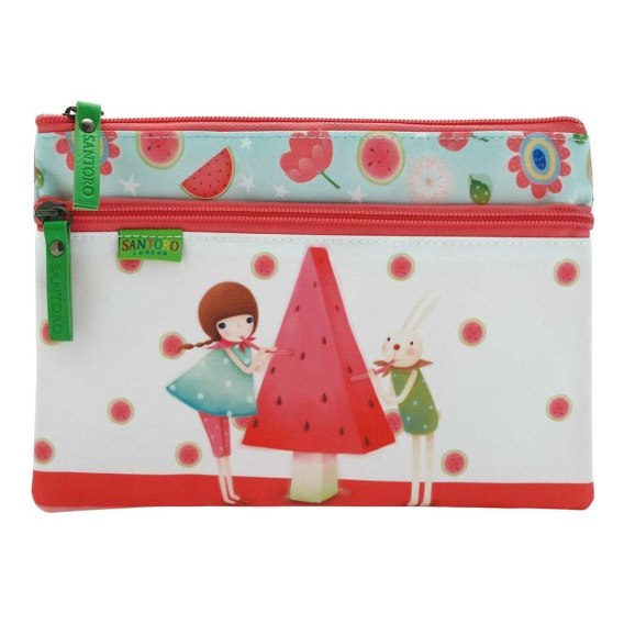 Płaska saszetka z dwoma suwakami - Kori Kumi - The Juice Tree Stylowa saszetka, która pomieści wszystkie akcesoria. Wnętrze wyściełane podszewką z logiem Santoro. Dwa suwaki sprawiają, że jest zarówno ładna i praktyczna. Czyścić wilgotną ściereczką. Wymiary produktu: 22 cm x 15 cm x 1,5 cm.