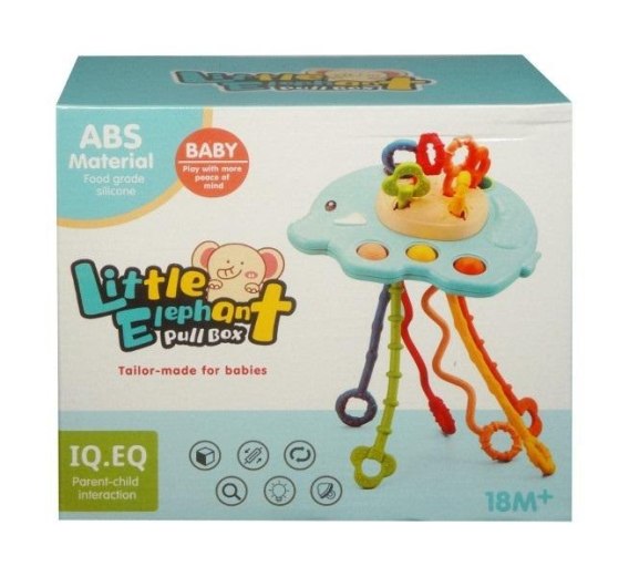 Plastikowo-gumowa zabawka dla malucha. Zabawka ma kształt słonika i posiada kolorowe gumowe linki w różnych kształtach i kolorach, które dzieci mogą przeciągać. Linki wykonane z bezpiecznej gumy, które dzieci mogą brać do buzi. Zabawka posiada również popularną zabawę pop it. Zabawka rozwija u dzieci logiczne myślenie, dzieci dzięki zabawce poznają kształty i rozwijają zmysł dotyku. Produkt zapakowany w kartonowe opakowanie. Podane wymiary są wymiarami opakowania.