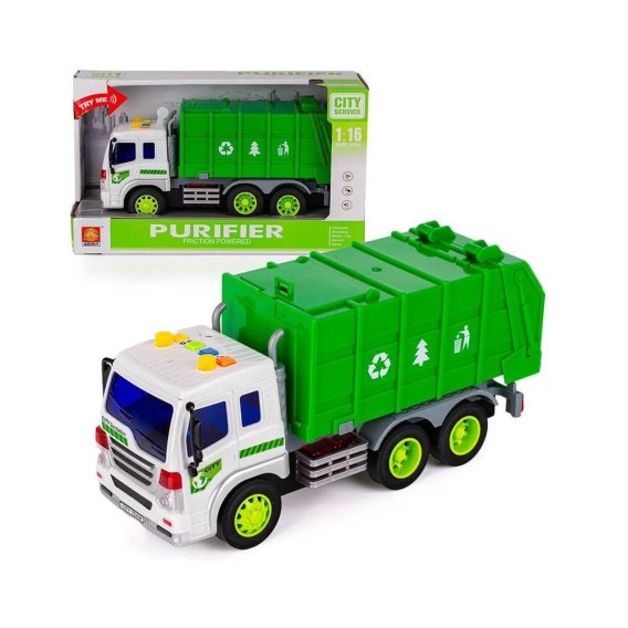 Zabawkowa śmieciara to ładnie wykonany samochód ciężarowy, który możemy często spotkać w przestrzeni miejskiej. To stały element miejskiej przestrzeni, w którym każdy mały urwis chętnie odnajdzie chwile zabawy z realistycznie wyglądającym pojazdem do wywozu śmieci. Śmieciarka to zabawka pełniąca także funkcję edukacyjne, dzięki którym dziecko może poznawać podstawy ekologii oraz recyklingu. Zabawka świetnie oddaje prawdziwy wizerunek dużej ciężarówki, a zabawa staje się znacznie atrakcyjniejsza przez ruchome elementy pojazdu - podnoszona skrzynia załadunkowa pojazdu - otwierana przyciskiem z boku pojazdu oraz podnoszona tylna pokrywa skrzyni załadunkowej. Całość zabawy dopełnią efekty świetlne oraz dźwiękowe odpalane za pomocą przycisków funkcyjnych umieszczonych na dachu pojazdu.
