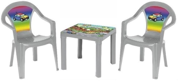 Zestaw: stolik i dwa krzesła, kolor Pastel szary, wtopiona etykieta IML z kolorowym motywem w blat stolika i oparcie krzesła uniemożliwa jego odklejenie i gwarantuje wysoką odporność na warunki atmosferyczne, do stosowania zarówno na zewnątrz, jak i wewnątrz